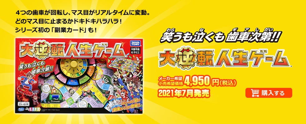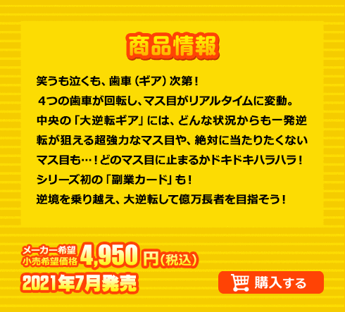 大逆転人生ゲーム 商品画像 笑うも泣くも、歯車(ギア)次第!4つの歯車が回転し、マス目がリアルタイムに変動。中央の「大逆転ギア」には、どんな状況からも一発逆転が狙える超強力なマス目や、絶対に当たりたくないマス目も…!どのマス目に止まるかドキドキハラハラ!シリーズ初の「副業カード」も!逆境を乗り越え、大逆転して億万長者を目指そう! メーカー希望小売価格 4,950円(税込) 大逆転人生ゲーム