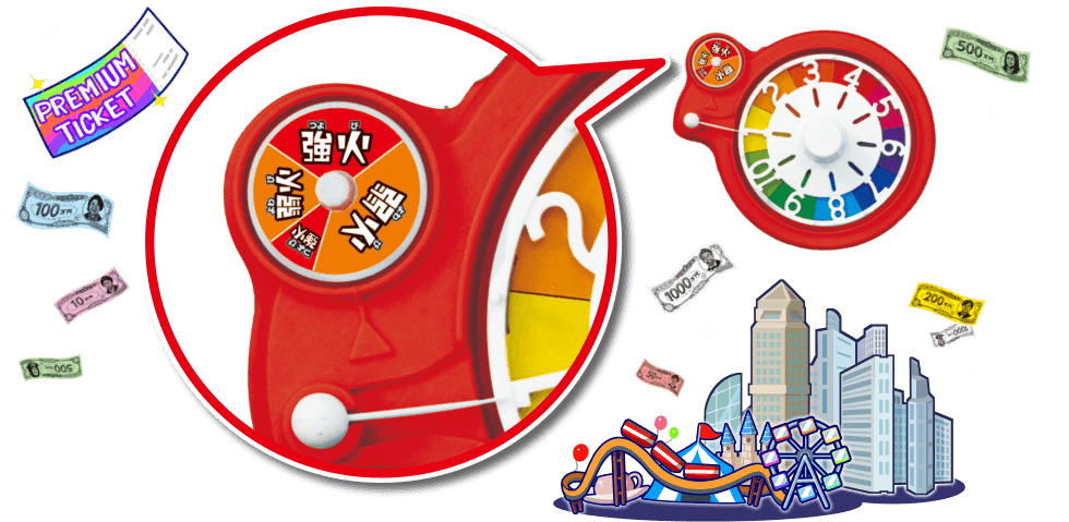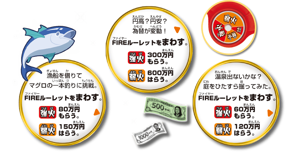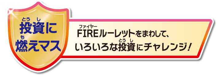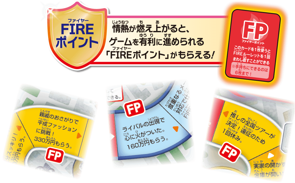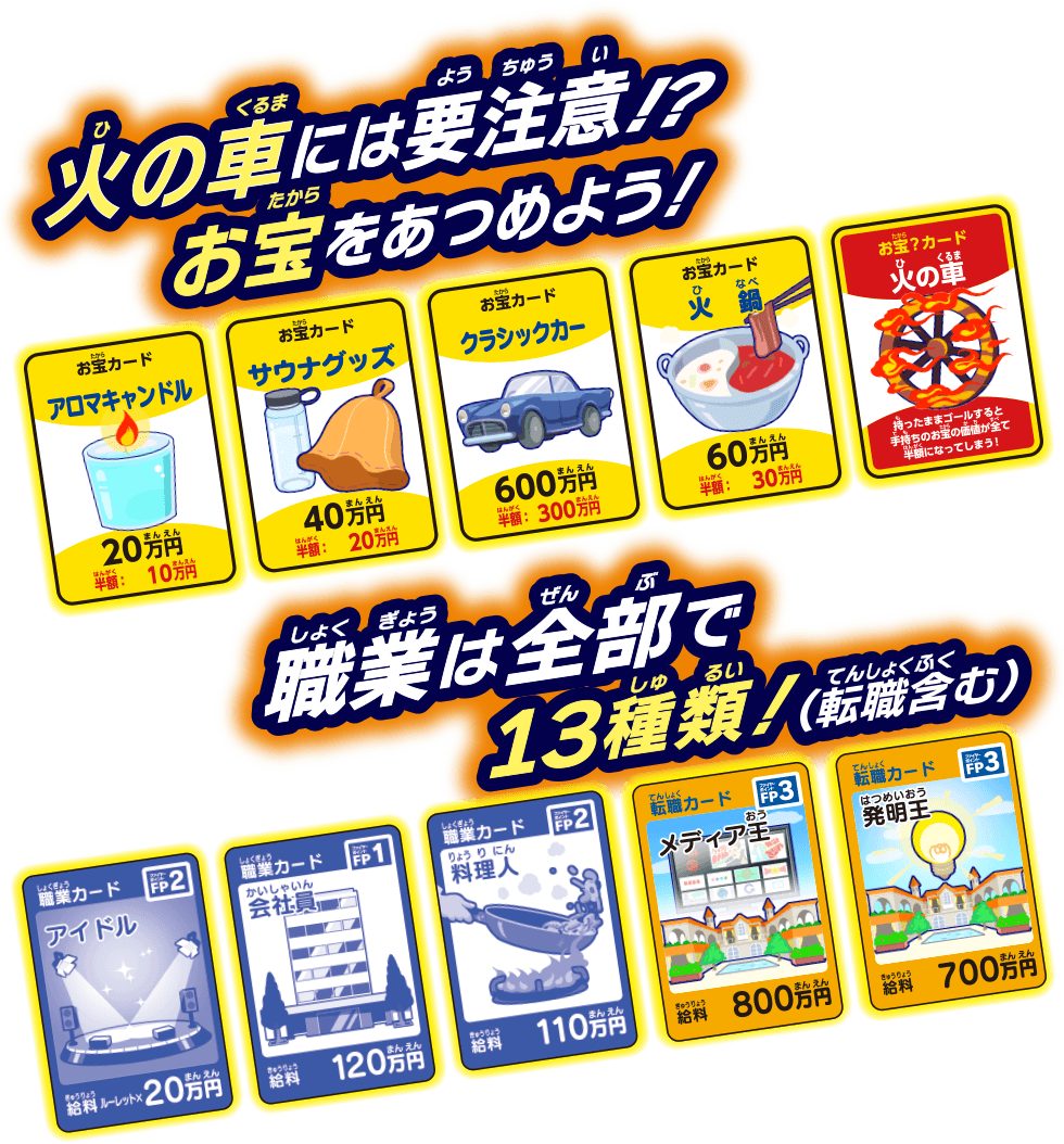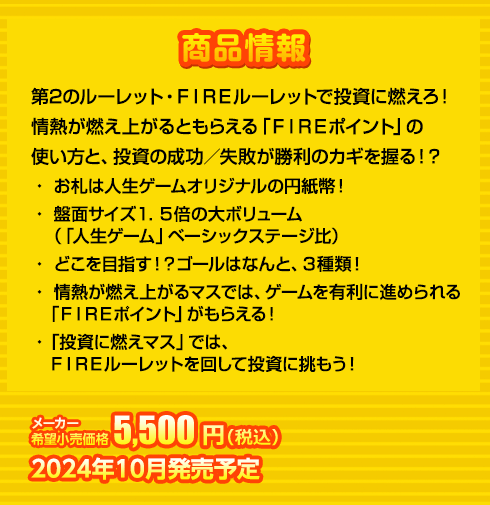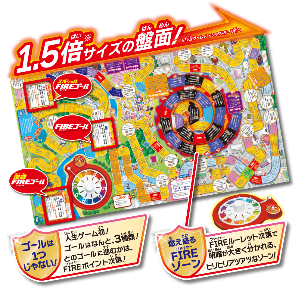 1.5倍サイズの盤面 人生ヒリヒリ!夢アツアツ! FIREルーレットで投資に燃えろ! お札は人生ゲームオリジナルの円紙幣! FIREルーレット 強火?それとも弱火?運命を握る、第のルーレット! FIREルーレット 投資に燃えマス FIREルーレットをまわして、いろんな投資にチャレンジ! いろんな投資にチャレンジ! FIREポイント 情熱が燃え上がると、ゲームを有利に進められる「FIREポイント」がもらえる! 火の車には要注意!? お宝をあつめよう! 職業は全部で13種類!(転職含む)