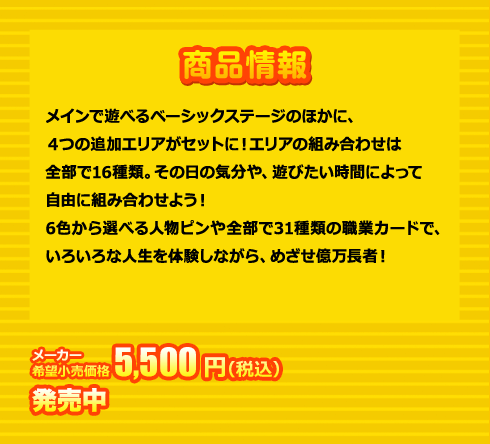 その日の気分や、遊びたい時間によって自由に組み合わせよう!6色から選べる人物ピンや全部で31種類の職業カードで、いろいろな人生を体験しながら、めざせ億万長者! 5,500円(税込) 発売中