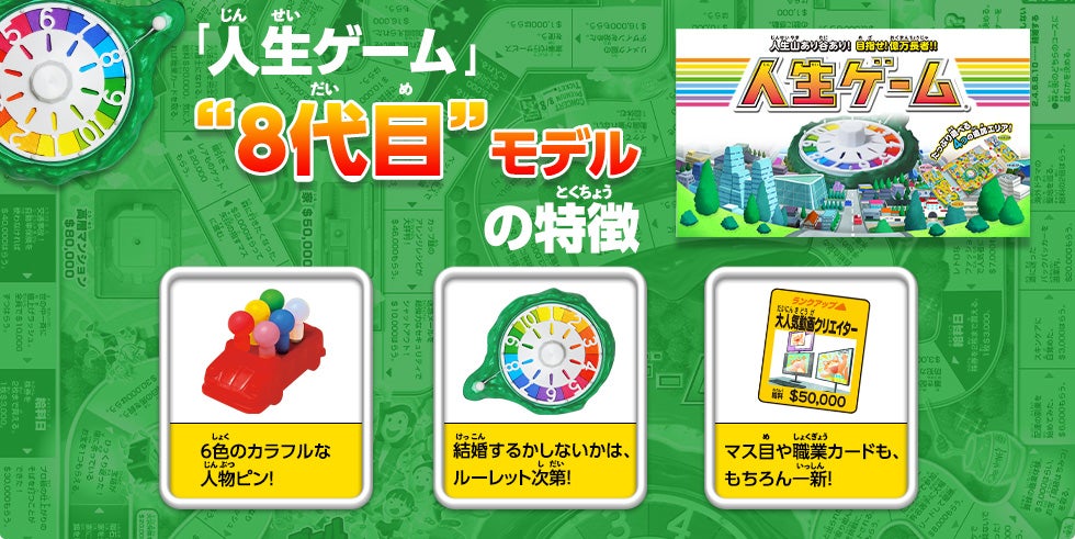 「人生ゲーム」“8代目”モデルの特徴 6色のカラフルな人物ピン! 結婚するかしないかは、ルーレット次第! マス目や職業カードも、もちろん一新! 「人生ゲーム」ヒストリー リニューアル記念!「人生ゲームあるある」特別公開中!あなたはいくつ共感できる?