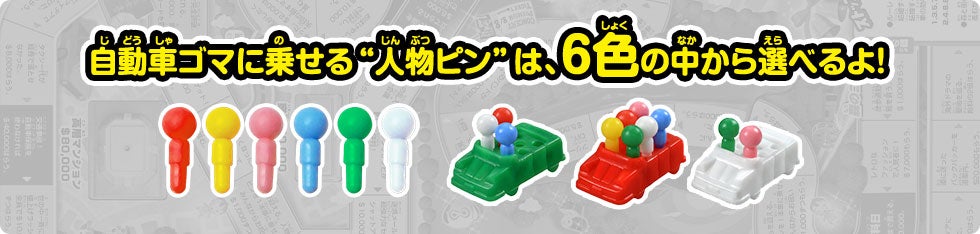 自動車ゴマに乗せる“人物ピン”は、6色の中から選べるよ!