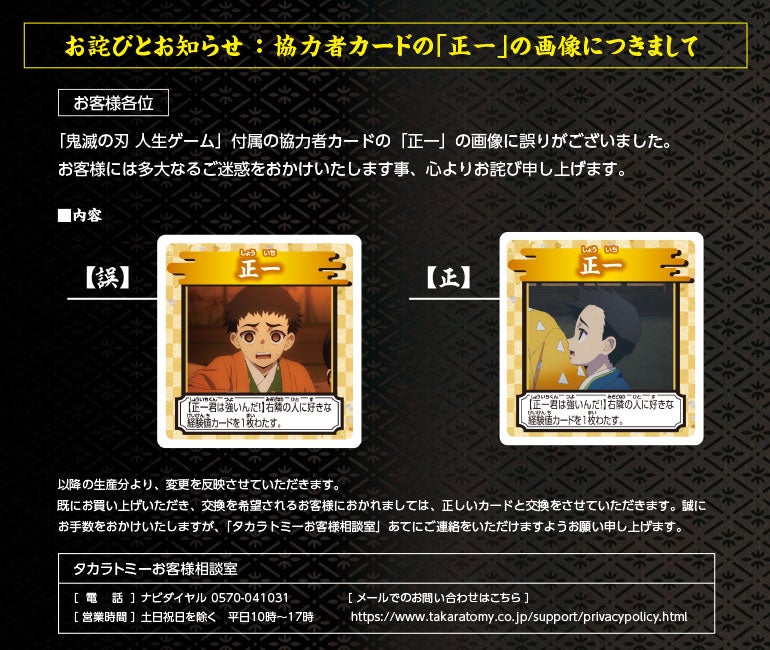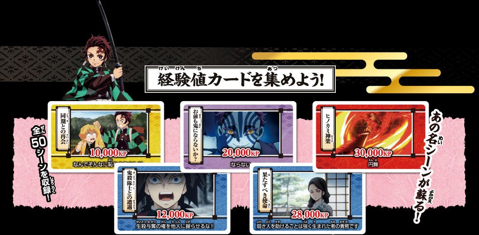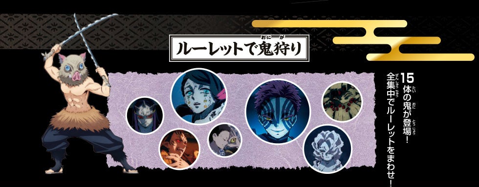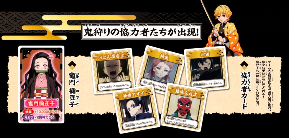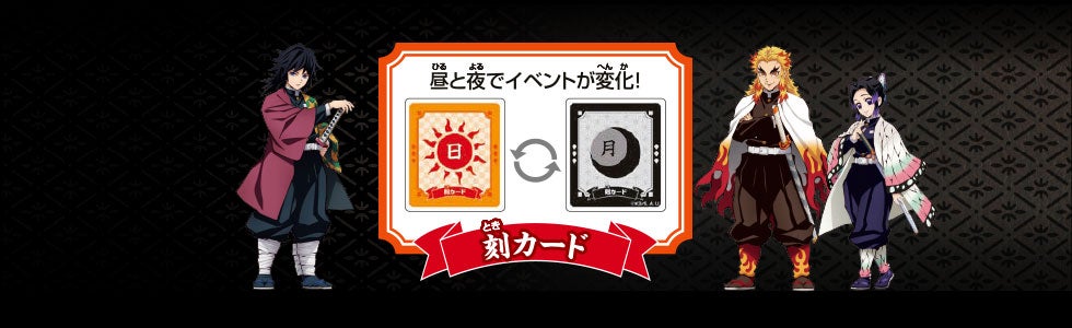 総登場キャラクターは50名以上! ルーレットをまわして、物語を紡げ! 経験値カードを集めよう! あの名シーンが蘇る! 全50シーンを収録! 鬼狩りの協力者たちが出現! お詫びとお知らせ:協力者カードの「正一」の表記につきまして お詫びとお知らせ:協力者カードの「正一」の表記につきまして ルーレットで鬼狩り 昼と夜でイベントが変化!