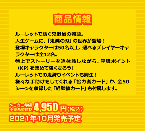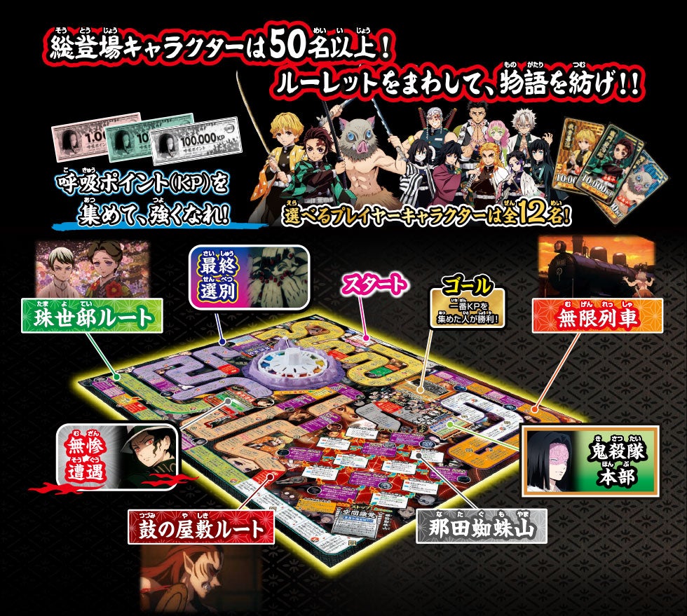 ルーレットで紡ぐ鬼退治の物語。人生ゲームに、「鬼滅の刃」の世界が登場!登場キャラクターは50名以上、選べるプレイヤーキャラクターは全12名。盤上でストーリーを追体験しながら、呼吸ポイント(KP)を集めて強くなろう!ルーレットでの鬼狩りイベントも発生!様々な手助けをしてくれる「協力者カード」や、全50シーンを収録した「経験値カード」も付属します。メーカー希望小売価格 4,950円(税込) 2021年10月発売予定