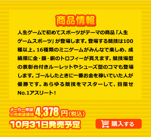 人生ゲームスポーツのルーレットはなんと競技場型に! 進めるコマもシューズ型のコマになっていて、最後の表彰式では 表彰台にコマを乗せることもできるぞ! 君のシューズを頂上に乗せよう!