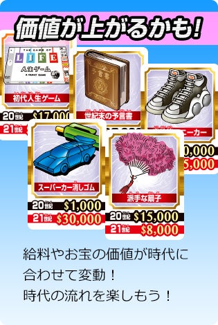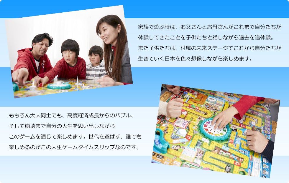 人生ゲーム タイムスリップ 楽しみ方 家族で遊ぶ時は、お父さんとお母さんがこれまで自分たちが体験してきたことを子供たちと話しながら過去を追体験。また子供たちは、付属の未来ステージでこれから自分たちが生きていく日本を色々想像しながら楽しめます。もちろん大人同士でも、高度経済成長からのバブル、そして崩壊まで自分の人生を思い出しながらこのゲームを通じて楽しめます。世代を選ばず、誰でも楽しめるのがこの人生ゲームタイムスリップなのです。