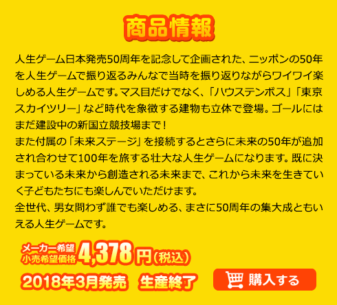 人生ゲーム日本発売50周年を記念して企画された、ニッポンの50年を人生ゲームで振り返るみんなで当時を振り返りながらワイワイ楽しめる人生ゲームです。マス目だけでなく、「ハウステンボス」「東京スカイツリー」など時代を象徴する建物も立体で登場。ゴールにはまだ建設中の新国立競技場まで!また付属の「未来ステージ」を接続するとさらに未来の50年が追加され合わせて100年を旅する壮大な人生ゲームになります。既に決まっている未来から創造される未来まで、これから未来を生きていく子どもたちにも楽しんでいただけます。全世代、男女問わず誰でも楽しめる、まさに50周年の集大成ともいえる人生ゲームです。メーカー希望小売価格 4,378円(税込) 2018年3月発売 生産終了