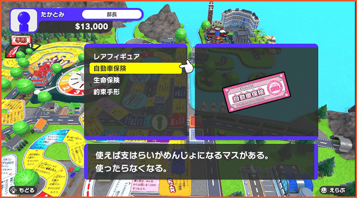 各保険を持っていると、対応するイベントの支払いが免除されたり、お金をもらえたりします。また、株券はマスの効果で価値が変動したり、高く売ることができたりします。所持している保険や株券は、「ステータス」内「アイテム」から確認できます。