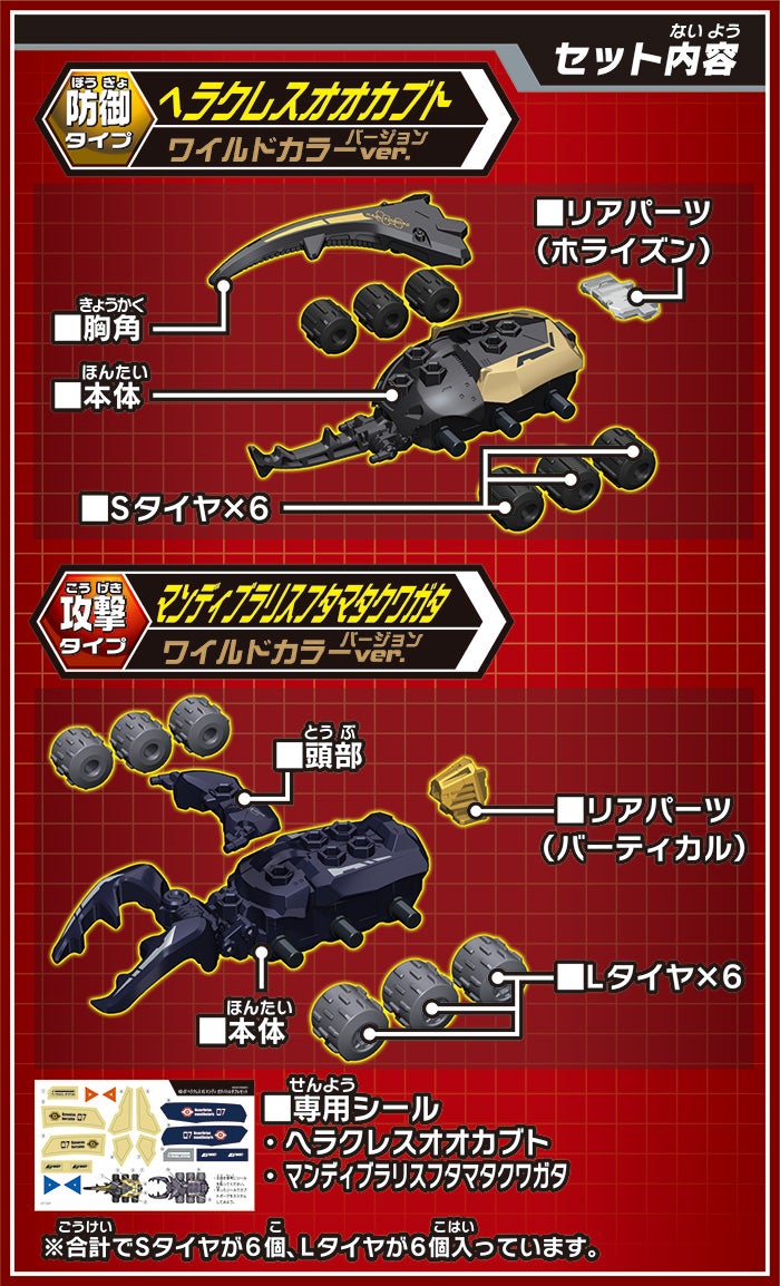 長い角で相手をいなし押し出す!人気No1カブトムシ「ヘラクレスオオカブト」〔ワイルドカラーver/防御タイプ〕とクワガタ最大級の大顎を持つ「マンディブラリスフタマタクワガタ」〔ワイルドカラーver/攻撃タイプ〕が入ったカブトボーグ2体セット!