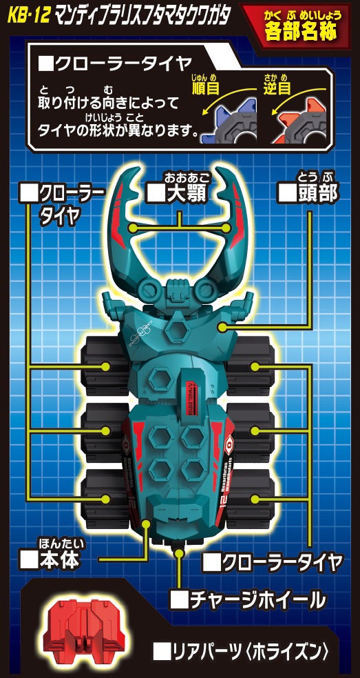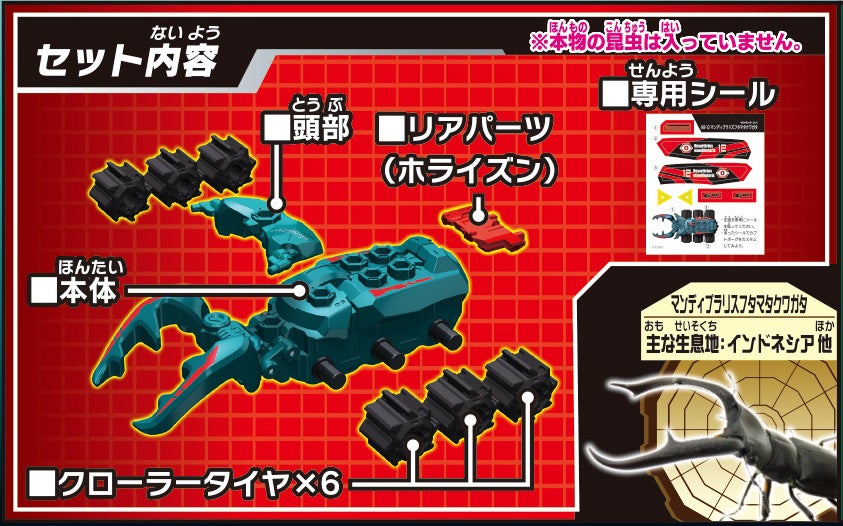 大人気「マンディブラリスフタマタクワガタ」が新型タイヤ/新カラーで登場!手裏剣のような新型タイヤ「クローラー」は「ラッシュバトルDXアリーナ(別売)」との相性は抜群!フィールド溝にくいつき推進力アップ!!