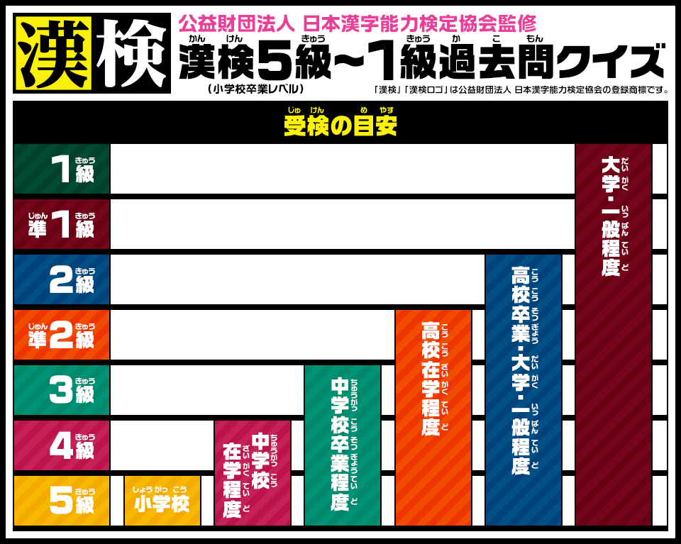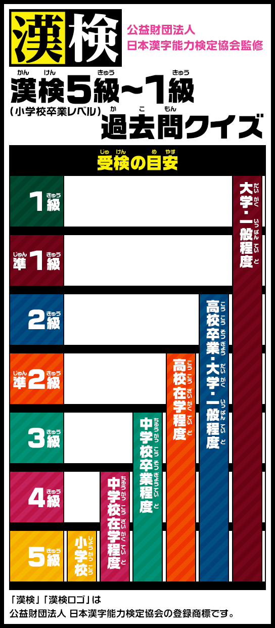 小学6年生修了レベルの5級から、最難関1級レベルのクイズまで収録されているので、自分のレベルにあった問題にチャレンジできる点も良いと思います。