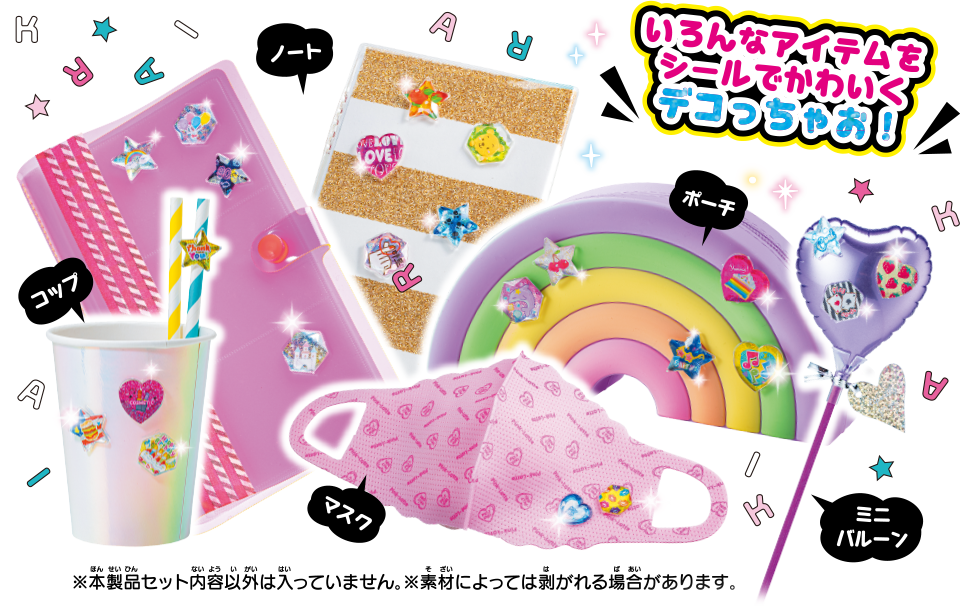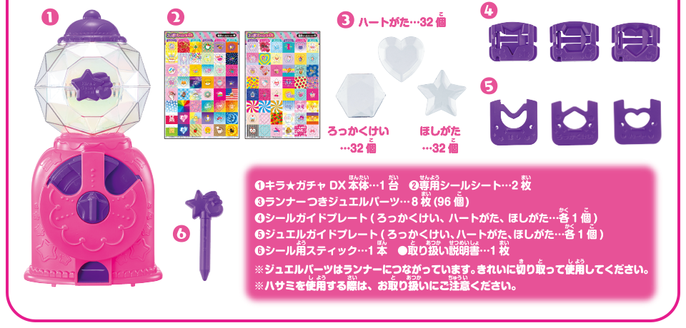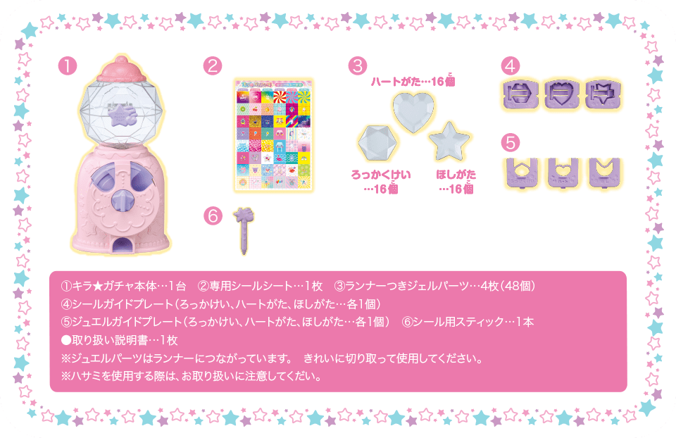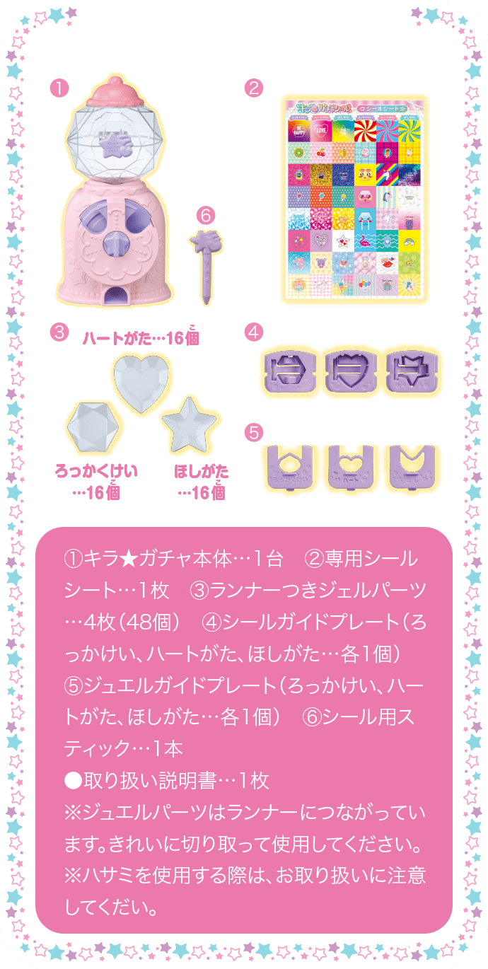 この商品で遊ぶには別売り『キラ★ガチャシール ラメジュエル』『キラ★ガチャシール』『キラ★ガチャシールDX』本体が必要です。