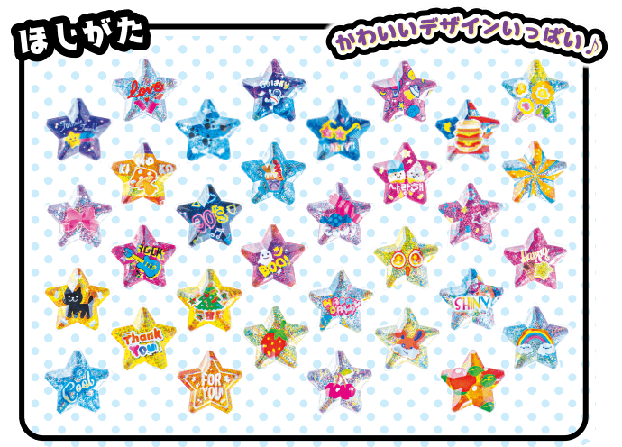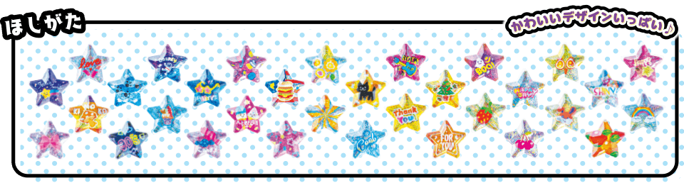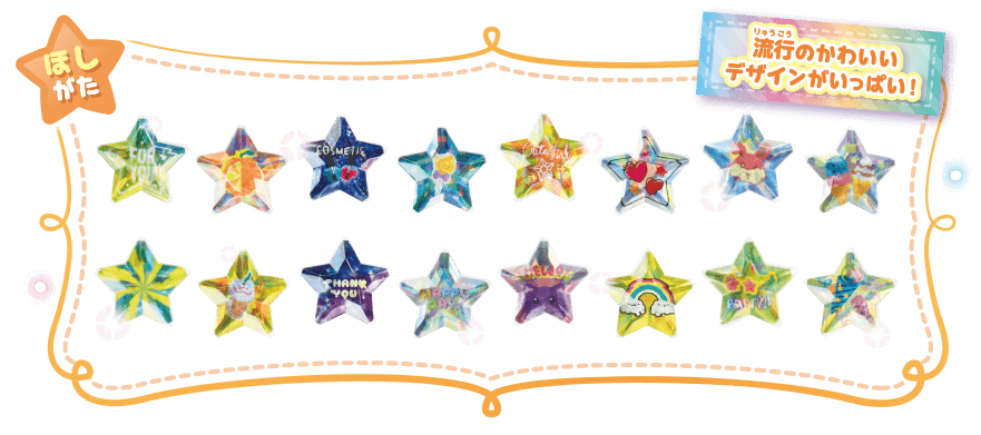 シールパーツは3種類あります(ほし型、ハート型、ろっかくけい)。