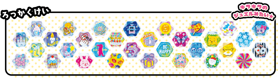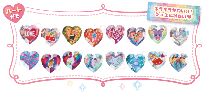ジュエルパーツはほし型、ハート型、ろっかくけいの3種類!