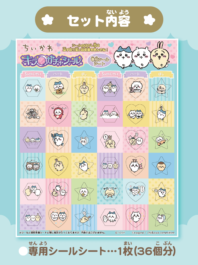 シールシートはオーロラカラー、ジュエルパーツはラメ入りでダイヤカットだから、「ちいかわ」のキラキラかわいいジュエルシールが全部で36個作れちゃう★