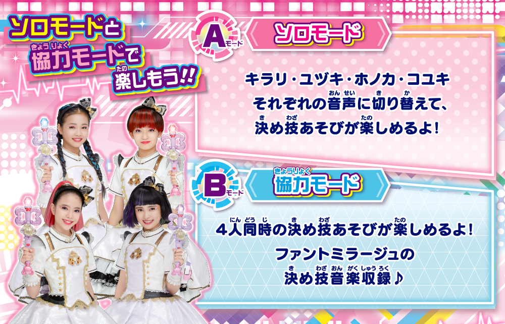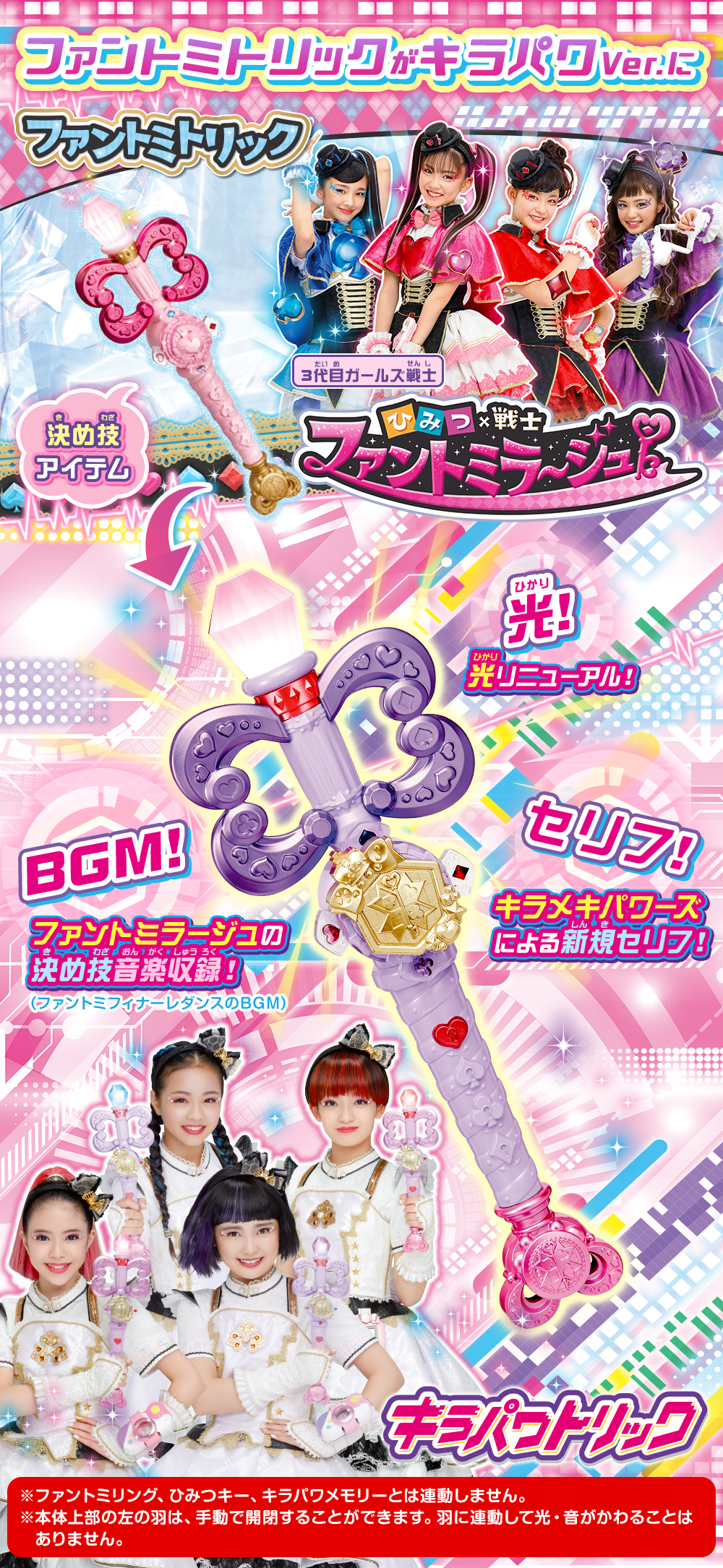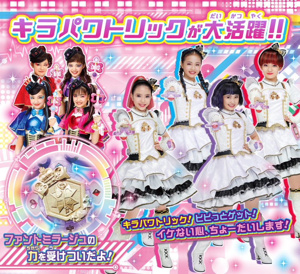 キラメキパワーズのドラマ内でも大活躍するキラパワトリックは、3代目ガールズ戦士「ひみつ×戦士 ファントミラージュ!」の決め技アイテム「ファントミトリック」をキラパワバージョンにアレンジしたアイテム!