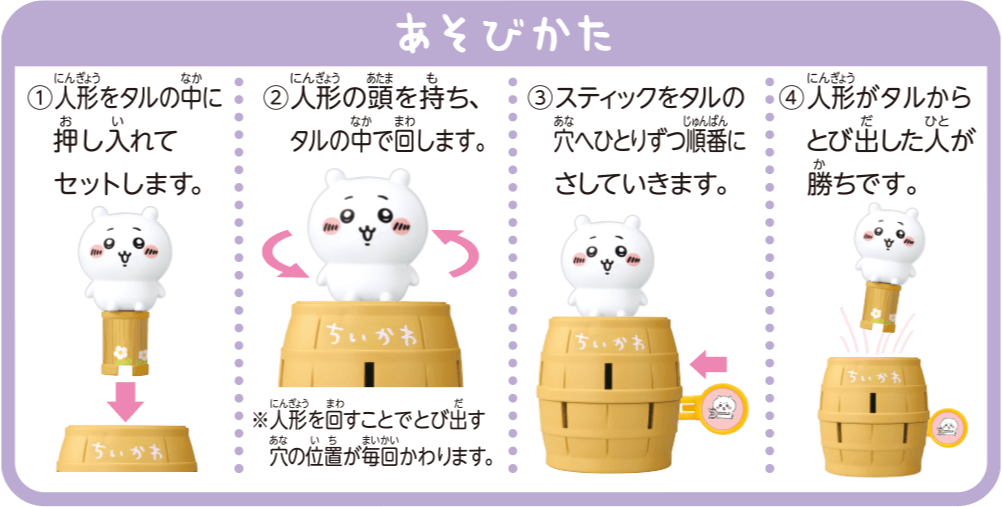 ちいさくてかわいい手のひらサイズのタルに、 好きなキャラクターの人形(ちいかわ・ハチワレ・うさぎ)を 選んでセットしよう! スティックをさすと、タルから飛び出すよ! 発売中 メーカー希望小売価格1,980円(税込) ©nagano / chiikawa committee ツイート