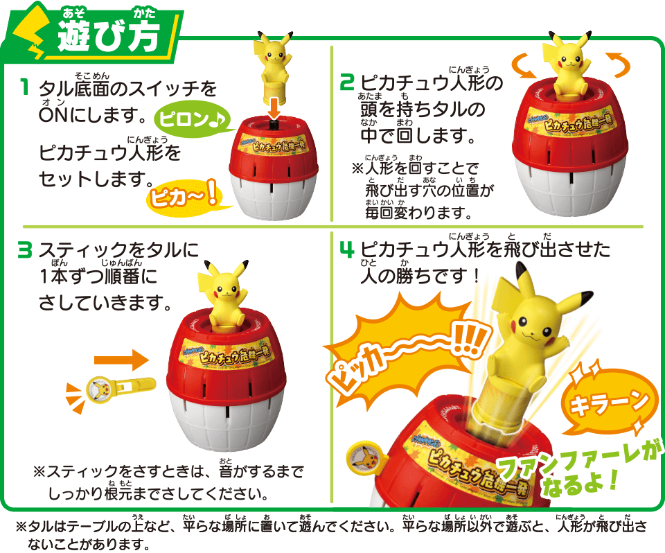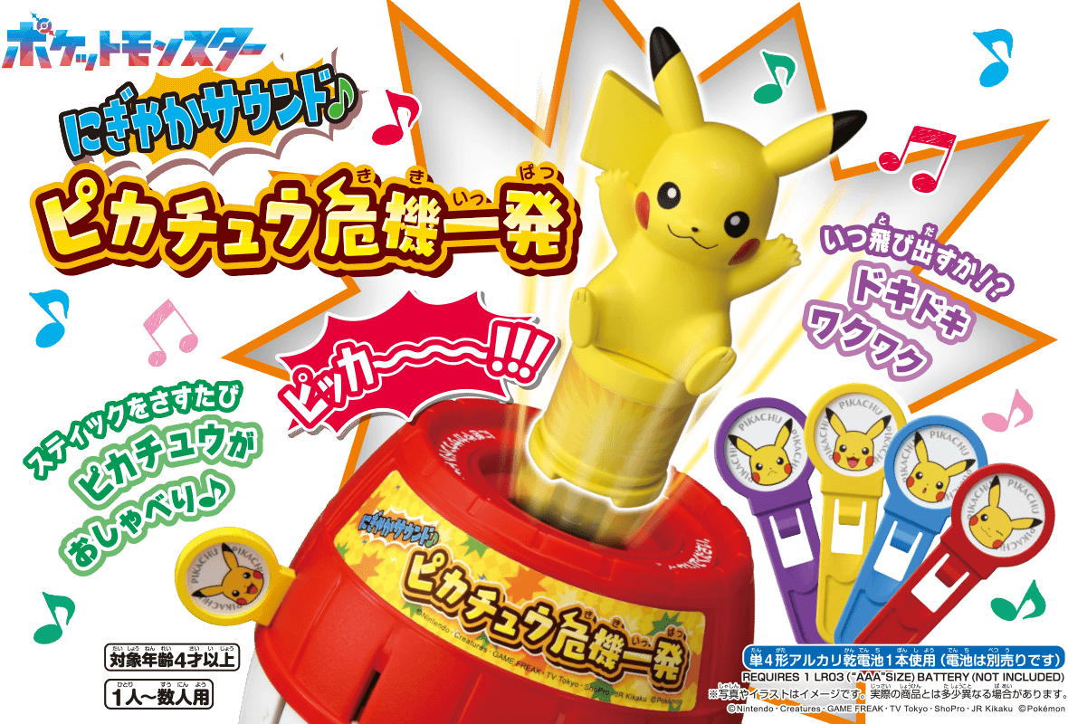 スティックをさすたび、ピカチュウのボイスが流れる!たのしいボイスは全15種類! 発売中 メーカー希望小売価格 3,520円(税込) ※対象年齢4才以上※単4形アルカリ乾電池1本使用(電池は別売りです) スティックをさすたび、ピカチュウのボイスが流れる!たのしいボイスは全15種類! 発売中 メーカー希望小売価格 3,520円(税込) ※対象年齢4才以上※単4形アルカリ乾電池1本使用(電池は別売りです) ©Nintendo・Creatures・GAME FREAK・TV Tokyo・ShoPro・JR Kikaku ©Pokémon ツイート