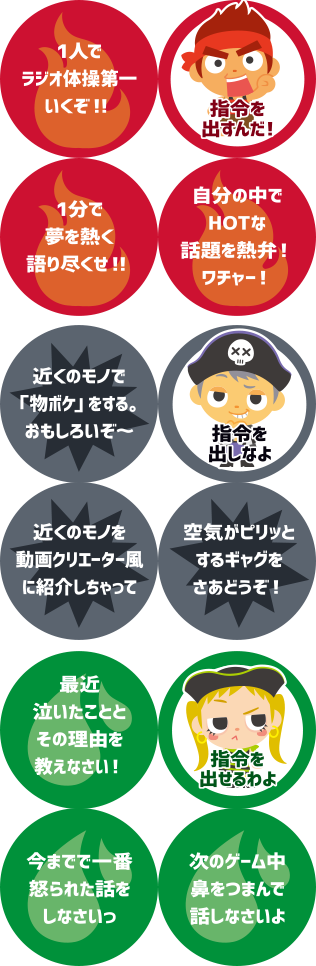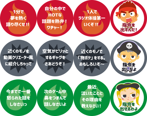 例:1人ずつモノマネを見せて!おすすめのお菓子を通販番組風に紹介して!など