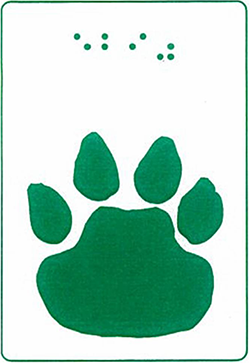 (ライオンの足あとと点字で“らいおん”と書いてあります。)