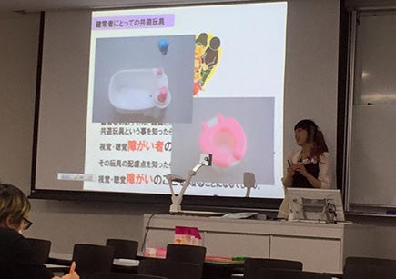 早稲田大学の学部・大学院生に、共遊玩具の歴史を初め、目や耳の不自由な子にとっての共遊玩具の大切さ、 障害者理解への共遊玩具の存在意義など、実際に共遊玩具に触ってもらいながら講義を行いました。