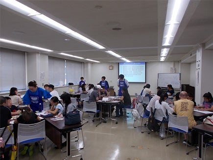 東京都多摩消費者生活センターの親子夏休み講座『いろいろなお友だちといっしょに楽しめる!おもちゃのバリアフリーってなんだろう?』で、バリアフリーと共遊玩具についてのお話をし、ワークショップを行いました。小学校3年生から6年生までの親子18組が、終始興味いっぱいのすてきな笑顔で参加してくださいました。