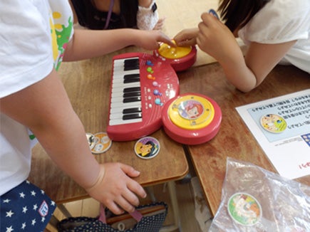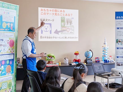 豆電球とLEDの発電体験を通じて省エネルギーについて学んだり、おもちゃのマークの研究を通じて、エコなおもちゃや目や耳の不自由なお友達とも一緒にあそべるおもちゃがあること、おもちゃは安心して遊べるように安全のための検査をたくさんクリアしていることを知りました。