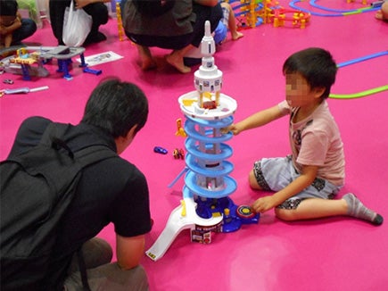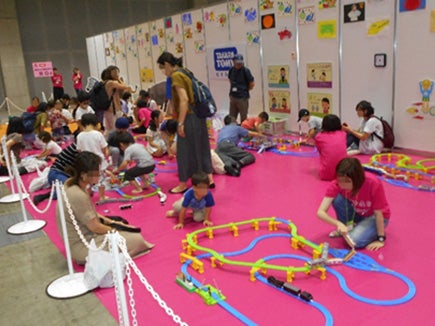 今年は「プラレール」、「トミカ」、「アニア」の定番体験コーナーのほかにバリアフリーのおもちゃ (トイパッドゲーム、変形ロボット、疑似体験の楽しいままごと、音遊びコーナー)も随所設けて、リハビリテーションセンターの専門スタッフの方々と一緒に運営いたしました。