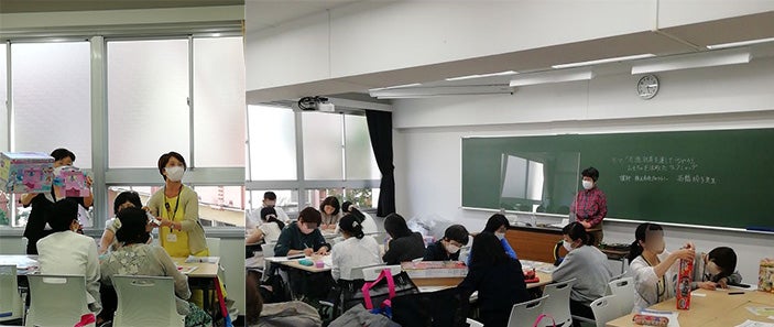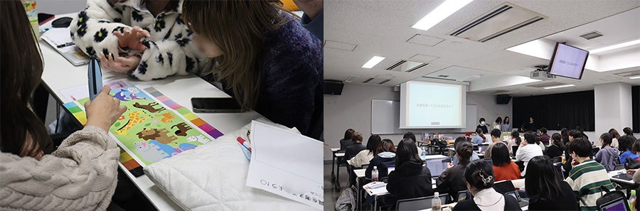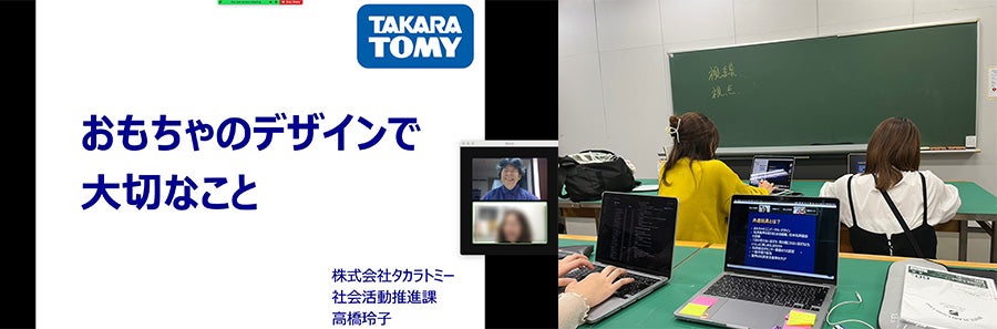 今年も事前に担当の学生さん数名がタカラトミーを訪ねてくださり、その方たちといっしょに講座の内容を計画しました。当日は、実際に共遊玩具をさわりながらその工夫点を探すワークをした後、学生さんたちに「あったらいいな」と思う共遊玩具のアイデアも考えていただきました。短い時間でしたが、子どものときに楽しんでいたおもちゃを「共遊玩具」にしようと一生懸命考えてくださる学生さんが多かったことが印象に残りました。