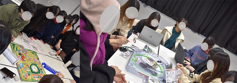 今年も事前に担当の学生さんたちがタカラトミーを訪ねてくださり、その方たちといっしょに講座の内容を計画しました。当日は、まず共遊玩具の意義や歴史と必要な工夫点を学び、その後グループに分かれて、「ベイブレード」と「人生ゲーム」について、実際に遊びながらどうすれば共遊玩具にできるかを検討してもらいました。学生さんたちは、今後わたしたちがぜひ取り組んでみたいと思うような楽しくすてきなアイデアをたくさん考えてくださいました。