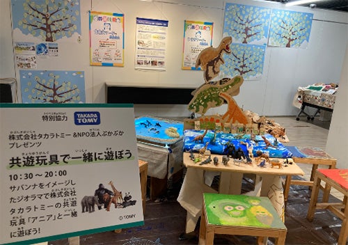 NPO法人ぷかぷか様で制作のライオンの顔がモチーフのサバンナをイメージしたジオラマ上で、来場した方々にはアニアを触って生き物達の形や動きなどを感じていただいたり、たくさんのお友達とも一緒に楽しく遊んでいただきました。