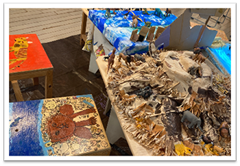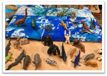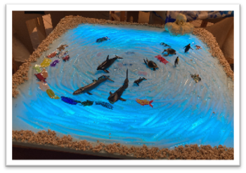 ジオラマはリサイクル品を利用されていて、ライトで光る海や恐竜のスペースなどもあり、また座りながら遊んでいただける椅子や床の敷物にも絵が描かれ、他にも恐竜のディスプレイなど、多数のアートが施され楽しめるようになっていました。