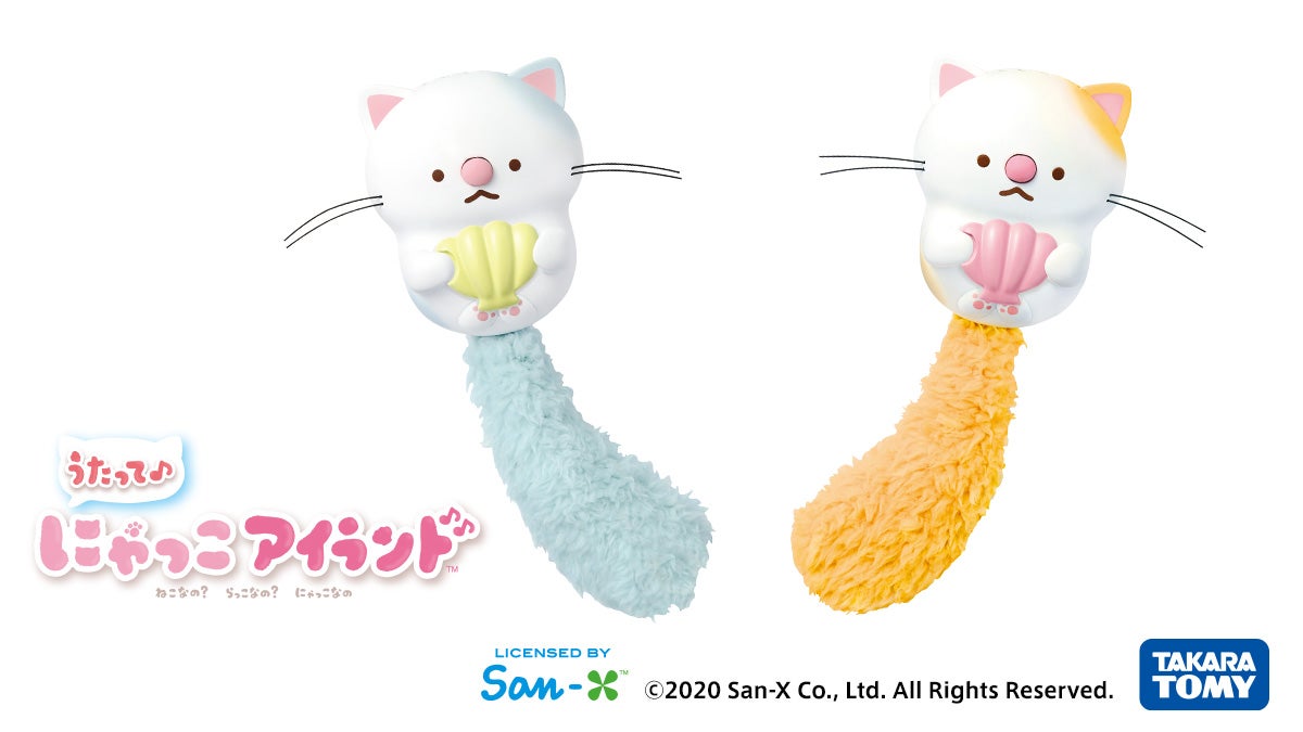 約50種類の歌声やおしゃべりなどが楽しめる、「にゃっこアイランド」の音楽玩具です。貝やわかめのアクセサリーを胸に乗せて、鼻を押したり、ひげやふわふわの尻尾にさわると、歌ったり喜んだり怒ったり楽器の音がしたりします。