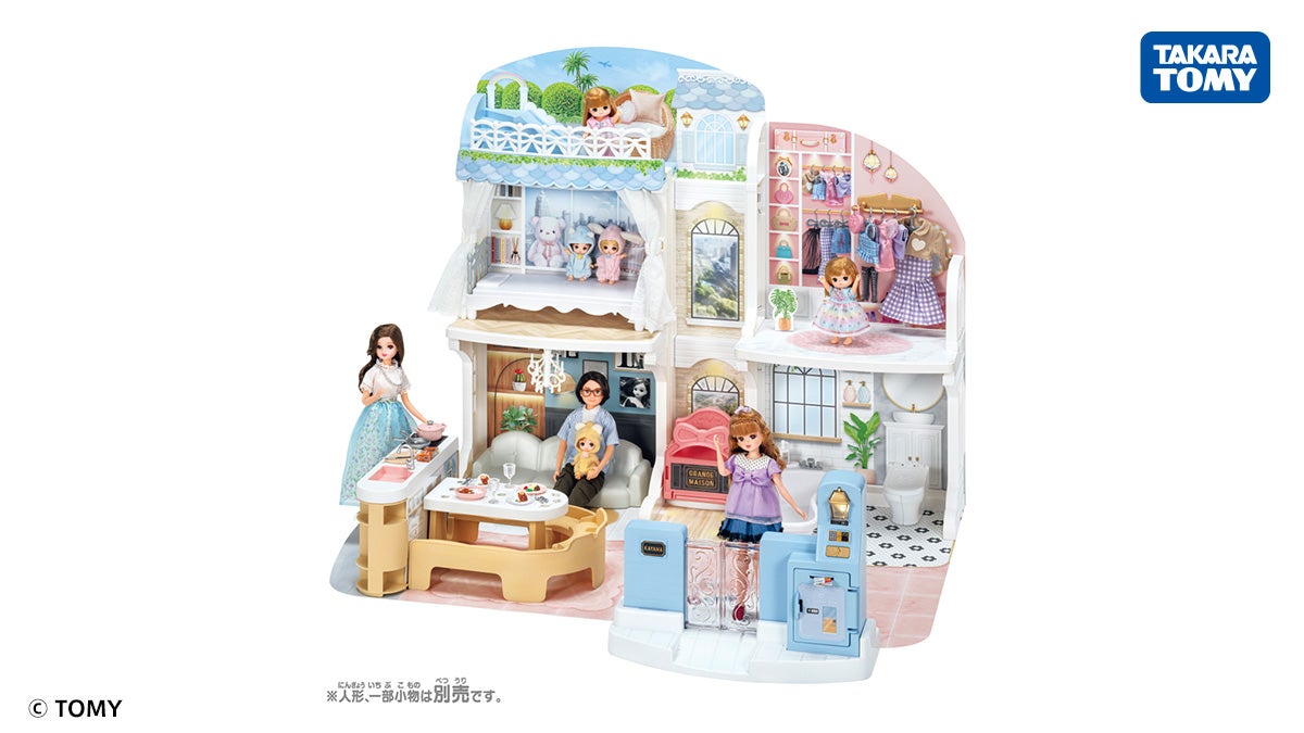 リカちゃんの新しい2階建ての大きなおうちです。おしゃべりいっぱいでギミックが豊富なげんかん、到着するとチンと音が鳴るエレベーター、電子レンジと食洗器の付いたキッチンやそのほかの家具も一式付属したオールインワン商品です。テーブルには小さなくぼみがあって、さわっても上に置いた小物類が倒れたりずれたりしにくいように工夫されているほか、チャイムやインターフォンはさわることで違いがわかるデザインになっています。