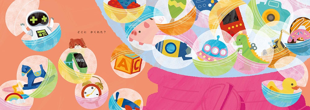 子どもにおなじみの場所、机の上・キッチン・冷蔵庫・洗面台・おもちゃ箱・スーパーマーケット・回転寿司などに隠れます。