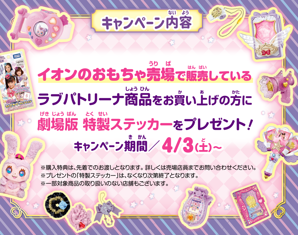 ラブパトリーナ商品をお買い上げの方に、下記店舗の玩具売場にて先着で