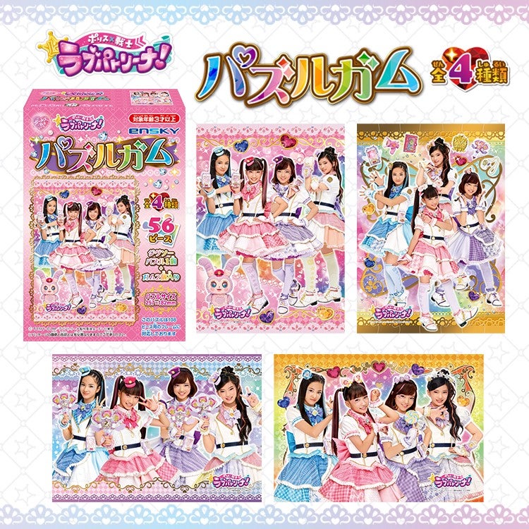 ラブパトリーナのジグソーパズルがガムつきで新登場。パズルは選べる4種類。パズルサイズはB5サイズ(257×182mm)。ピースが大きめに作られているので、小さなお子様にも組み立てやすいサイズです。