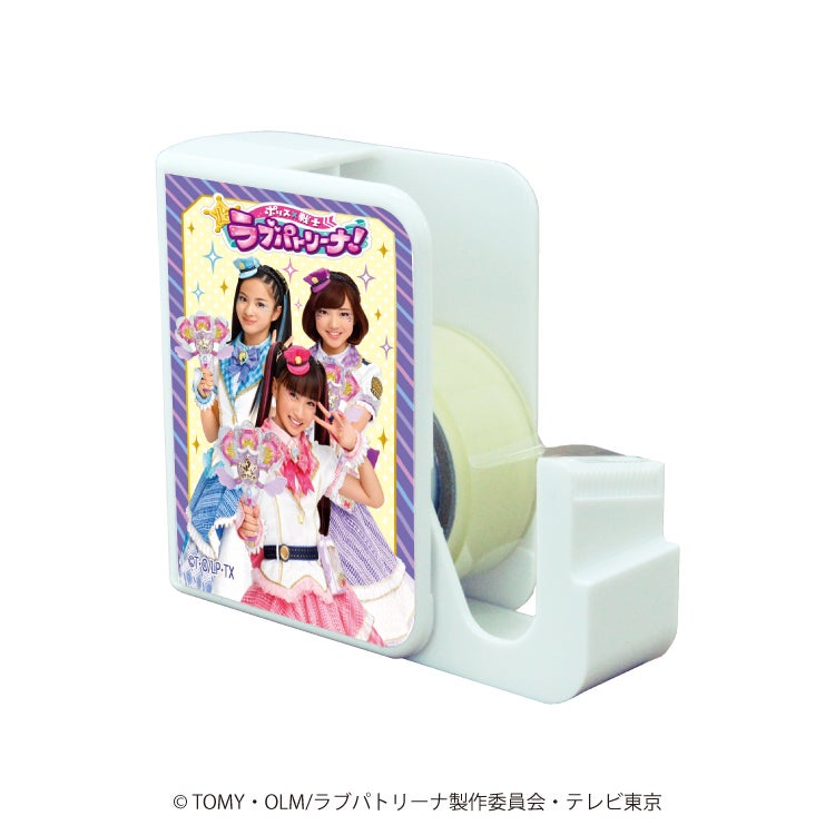 手を傷つけにくく、テープにほこりがつきづらい収納式のテープカッターです♪ラブパトウィングを手にポーズを決めたラブパトリーナのデザインです◎