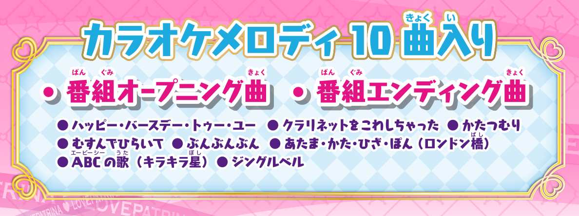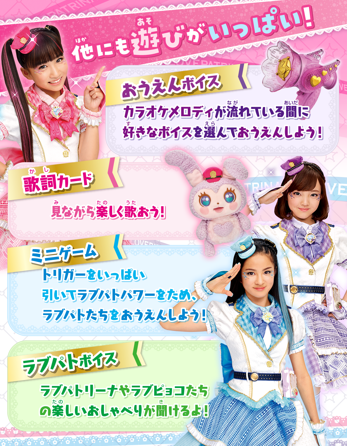 ラブパトリーナを応援するためのアイテム!いっぱい歌って&踊ってラブパトリーナを一緒に応援しよう!番組「ポリス×戦士 ラブパトリーナ!」のオープニング曲とエンディング曲を含む全10曲のカラオケメロディが収録されているよ!「おうえんボイス」機能を使ったり、付属の歌詞カードを見ながら歌って楽しもう!他にも「ラブパトボイス」でラブパトリーナやラブピョコのおしゃべりを楽しんだり、トリガーを引いて楽しめる「ミニゲーム」など遊びがいっぱいつまった応援アイテム!※拡声機能はついていません