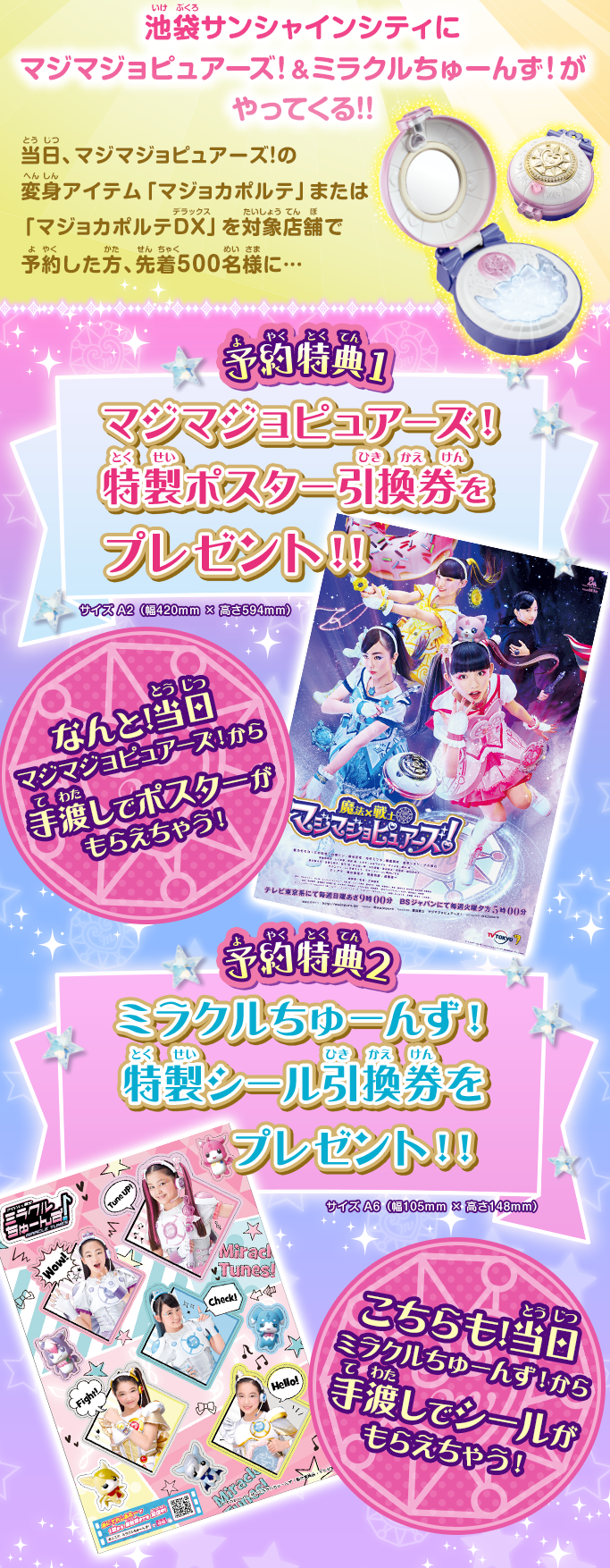 - ※ポスターとシールをお渡し時の握手、ハイタッチなどマジマジョピュアーズ!およびミラクルちゅーんず!本人たちとの接触や写真撮影などは禁止しておりますのでご了承ください。