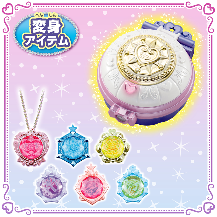 劇中と同じ動きや「セリフ」「BGM」「光」で変身シーンを再現することができる変身アイテムです。ハートルビーを含むマジョカジュエル6個つき。