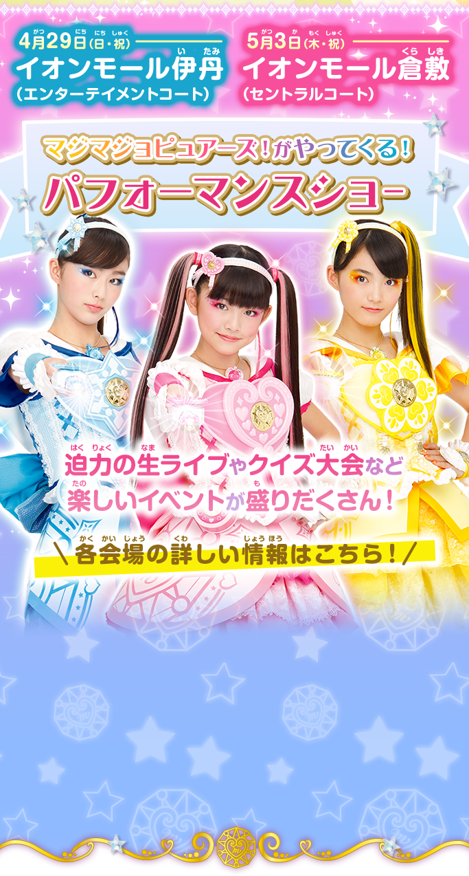 - ※購入特典「魔法戦士認定証(直筆サイン入り)」をお渡し時の握手、ハイタッチなどマジマジョピュアーズ!本人たちとの接触や写真撮影などは禁止しておりますのでご了承ください。