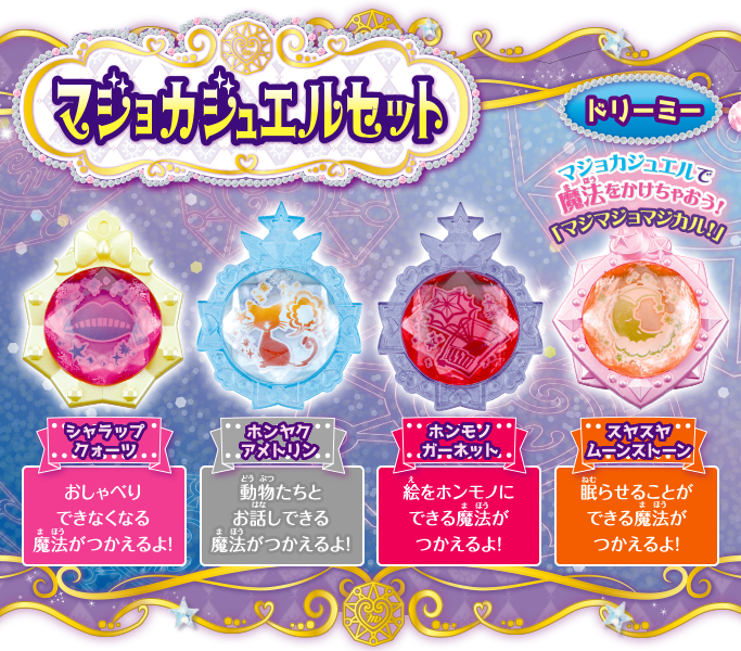 モモカ達が使用するマジョカジュエルが4個入っているセットです。いろいろな魔法の力が宿った不思議なマジョカジュエルです。他のなりきりアイテムと一緒に遊ぶと遊びがどんどん広がります。※付属マジョカジュエル(4個):シャラップクォーツ,ホンモノガーネット,ホンヤクアメトリン,スヤスヤムーンストーン