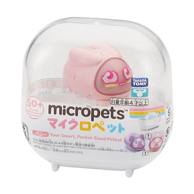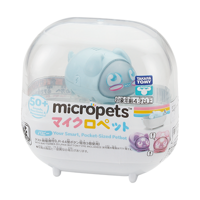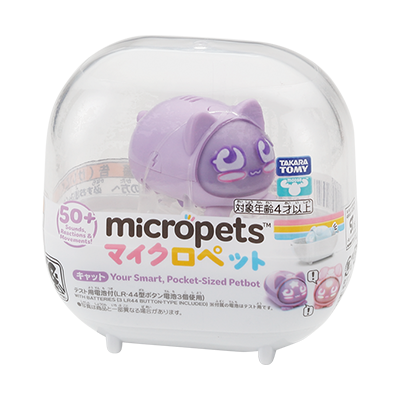 手のひらサイズで、かしこくかわいい!デジタルKAWAIIペットロボット! 50種類以上の表情、音、動きで、感情を豊かに表現するよ! 「おしゃべり」や「トイレ」など、マイクロペットのリクエストに応えてあげることで、どんどん成長! さらに、2台以上で他のマイクロペットと通信!一緒にダンスやレース、歌も歌うよ♪