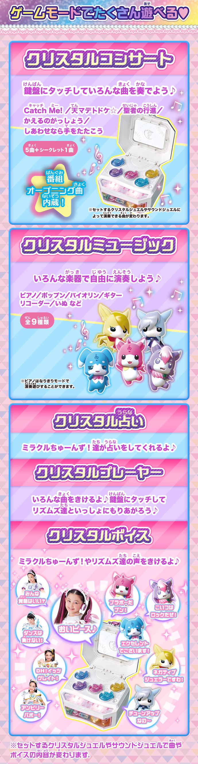 発売中のすべてのサウンドジュエルに連動するほか、ボイス遊びや占いなどミニゲームが5種も入っており、遊びが満載です。