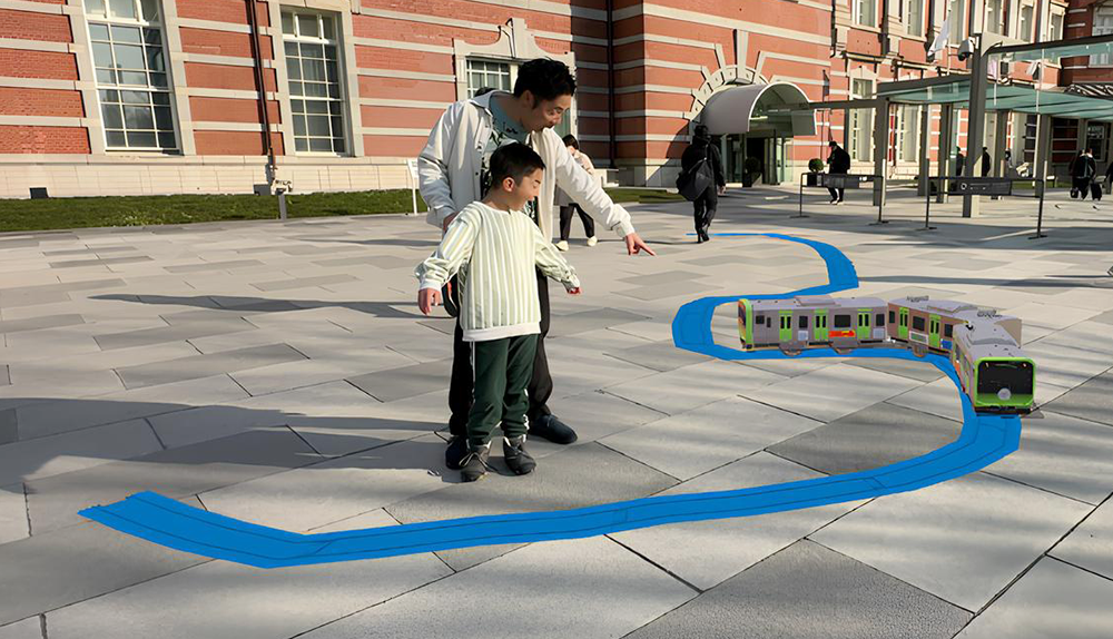 特別なプラレール E235系山手線と記念撮影できるだけでなく、自分で好きなようにARレールを引き、その上にARプラレールを走らせるアソビができることで、繰り返しあそべるようになっています。