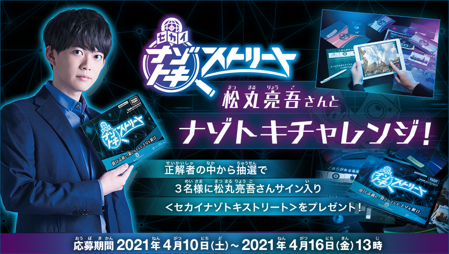 タカラトミー公式Twitter(@takaratomytoys)アカウントをフォローし 対象ツイートのナゾの正解をツイートした人の中から、抽選で3名様に 松丸亮吾さんのサイン入りのセカイナゾトキストリート商品をプレゼントします!