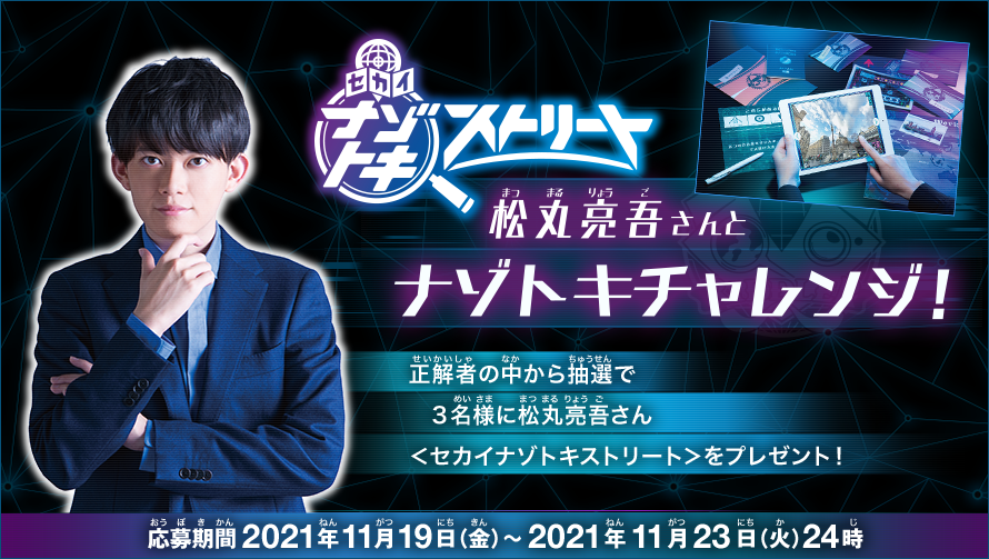 タカラトミー公式Twitter(@takaratomytoys)アカウントをフォローし 対象ツイートのナゾの正解をツイートした人の中から、抽選で3名様に 松丸亮吾さんのセカイナゾトキストリート商品をプレゼントします!