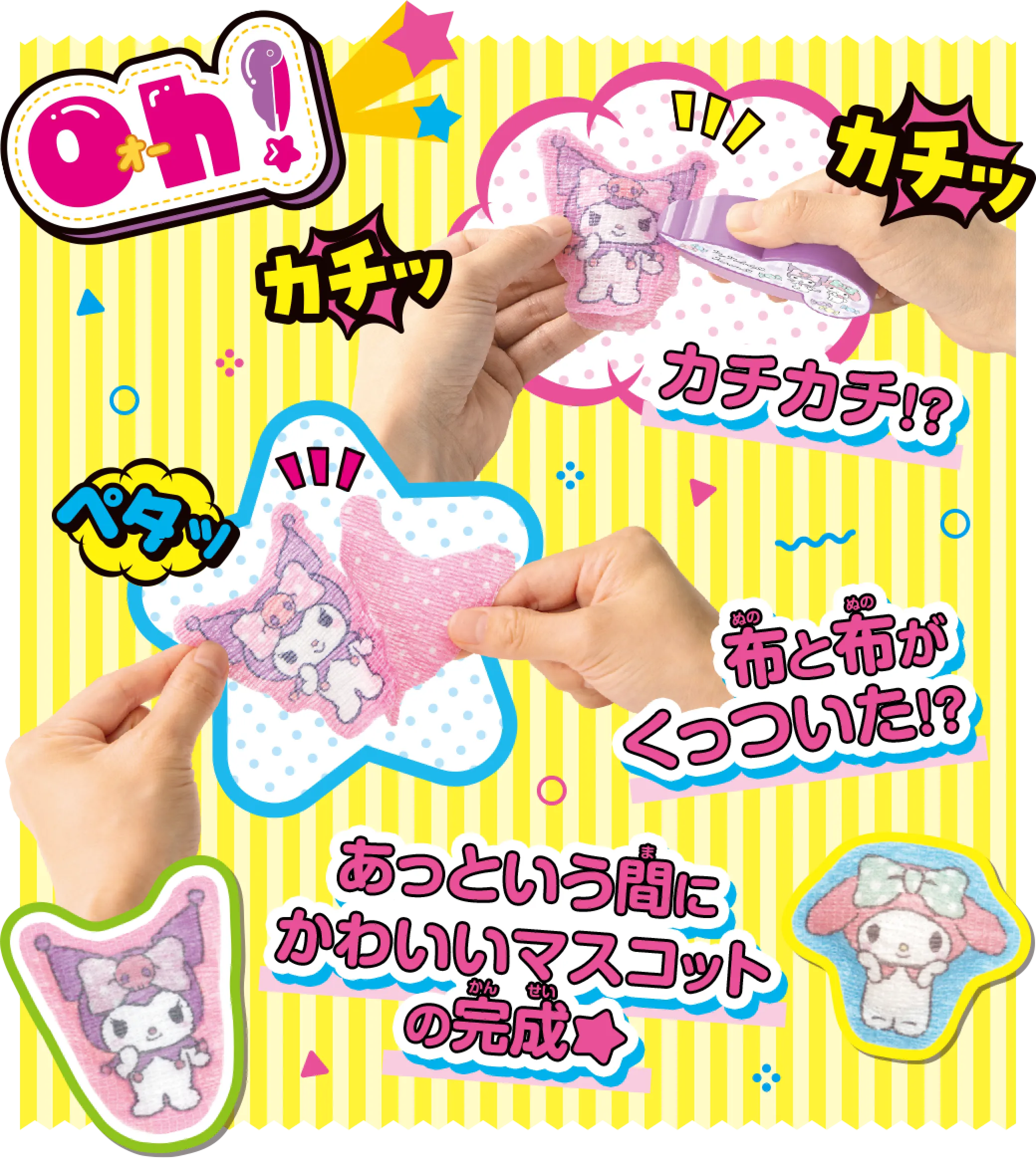 カチカチすると…布と布がくっついた!?あっという間にマイメロディ&クロミのマスコットが完成!