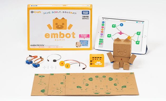 「embotすみっコぐらしをつくろう!ダンボールキット」では、パーツを選んで5つのキャラクターのうちどれか1つを作ることができます。embotスターターキットの電子工作パーツと組み合わせると、プログラミングで動くあなただけのすみっコぐらしキャラクターの完成です!