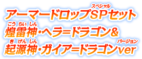 2017年7月より、一部のパズドラクロス アーマードロップSPセット第2弾煌雷神・ヘラ=ドラゴン&起源神・ガイア=ドラゴンver.の交換対応をいたしておりましたが2019年11月15日以降、このセットに含まれるアーマードロップの連動も終了いたします。